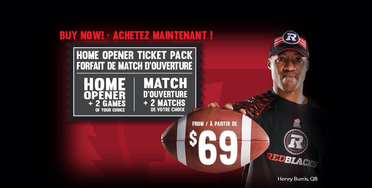 Starting from $69.00 (or $23/game) + taxes/fees, Redblacks fans have the opportunity to get a ticket to the home opener plus any two other home games. The packages went on sale March 22nd at 10:00am, with fans buying online, by phone and in person. Before close of business on the 22nd, the team announced that the $168.00 ticket packs had sold out. The most expensive packages remaining are $123.00 (or $41/game) + taxes/fees.