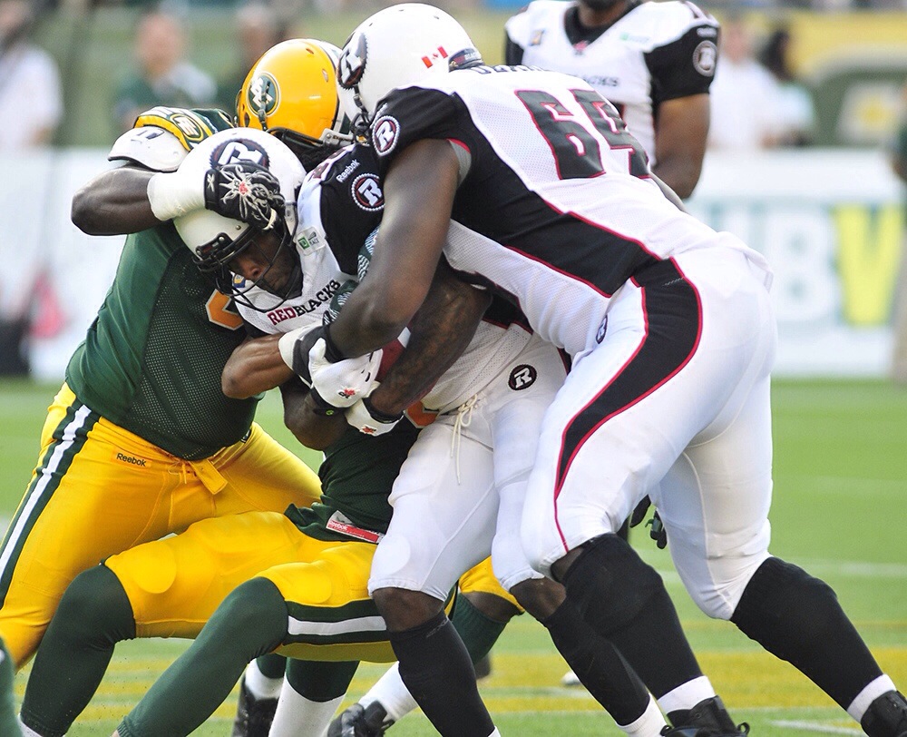 – DB Jovon Johnson (#2) proves that the Redblacks defense isn’t entirely allergic to tackling and sacks LeFevour