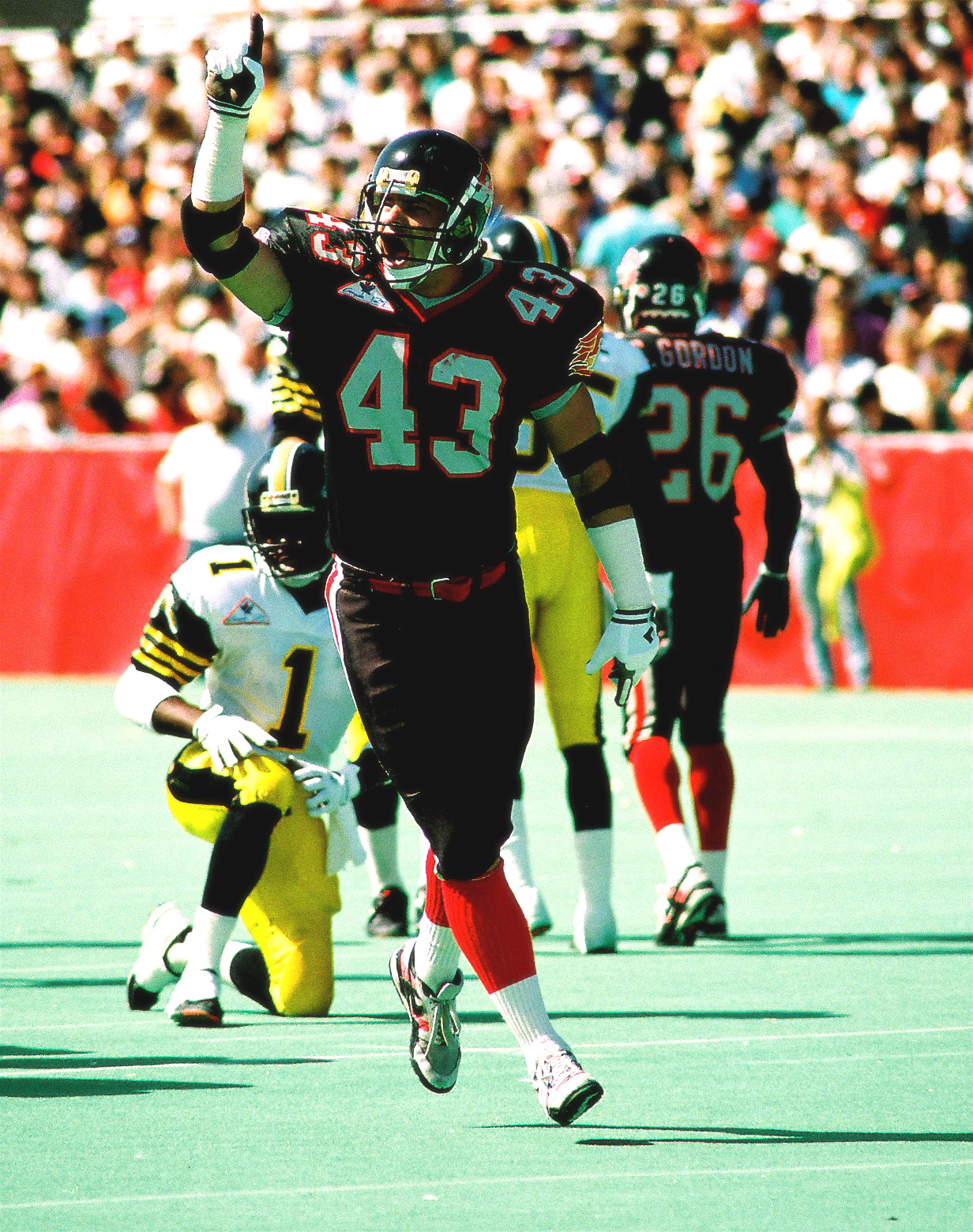 – Deep in the red zone, Travis “Sticky Fingers” Brown (#43) steps in front of Brandon Whitaker to pick off Crompton and ends the Al’s scoring threat