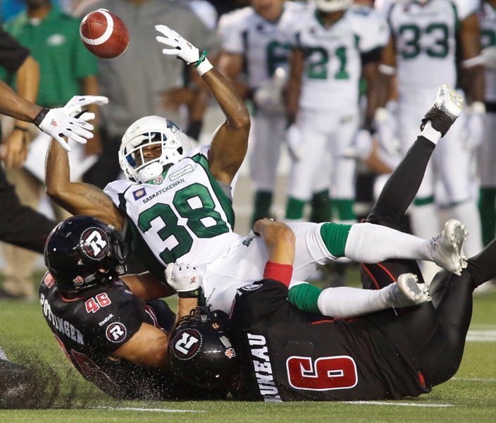 – Wallace Miles (#84) and Khalil Paden (#13) haul in passes to move the Redblacks within range for an end of half end zone heave but Chip Cox knocks the pass down