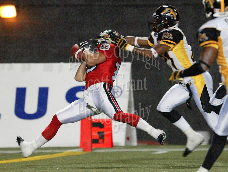 Field conditions were lousy, and it had been a really slow start to the game for both sides. During the week, we’d played around with different receiver formations to capitalize on match ups. For this play, I ended up in the slot closest to Anthony Calvillo on the wide side of the field. The route was called D97; the receiver outside of me had a “Go” or “9” route, and I was running diagonally across the field. Basically the safety had to choose one of us, and he chose poorly. As the ball got to me I could feel him just missing the tackle behind me, then it was a pure sprint to the end zone. When I got to the sideline, Chris Cuthbert told me that I’d set the record for longest TD reception in the Grey Cup. For a Canadian kid who grew up with the Grey Cup being the biggest day of the year, it was a pretty surreal moment.