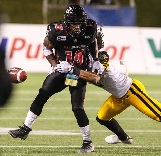 – Brandyn Thompson (#25) blows up Toronto RB Steve Slaton as he reaches for an over throw, but the Argos made it look easy as back up QB Trevor Harris picks apart the Redblacks secondary. Soft coverage + weak tackling = an Argo touchdown